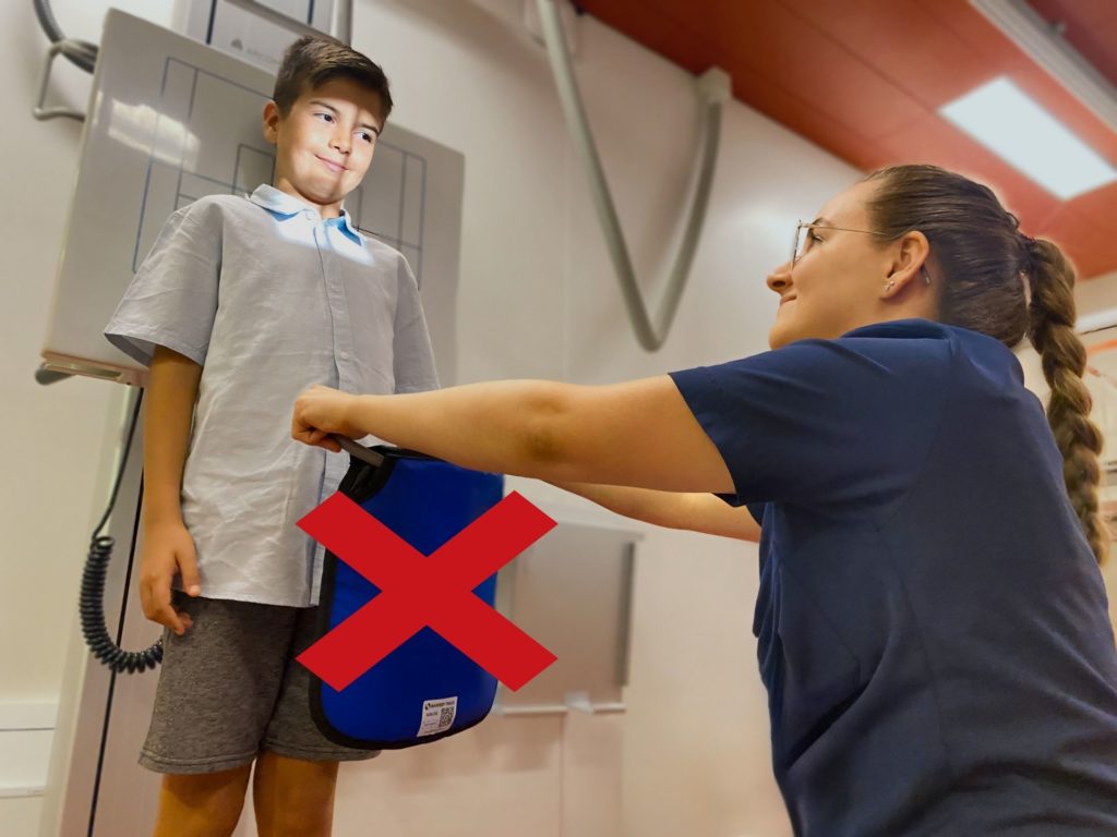Die gewohnten Schutzmittel reduzieren die ohnehin geringe Strahlenbelastung bei Patient*innen nur minimal. Durch den Verzicht auf diese Schutzmittel entfällt auch das Risiko, dass sie unbeabsichtigt in den Untersuchungsbereich gelangen und somit möglicherweise Nachteile wie eine schlechtere Bildqualität oder eine negative Beeinflussung der Strahlenbelastung entstehen.